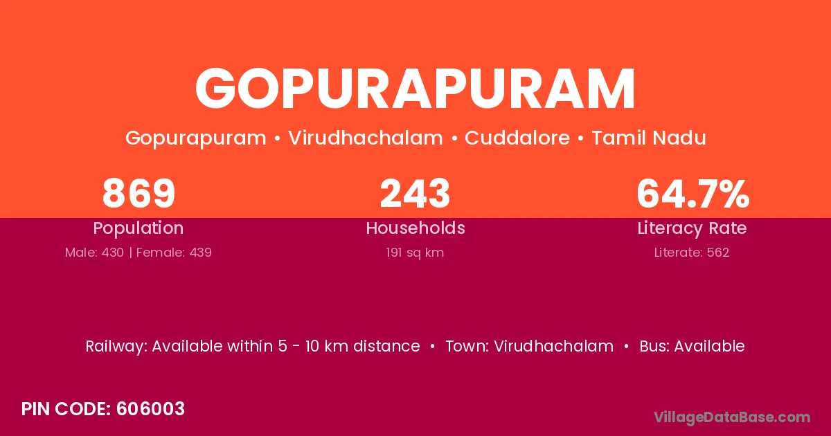 According to Census 2011 information, the village code of Gopurapuram village is 606003.