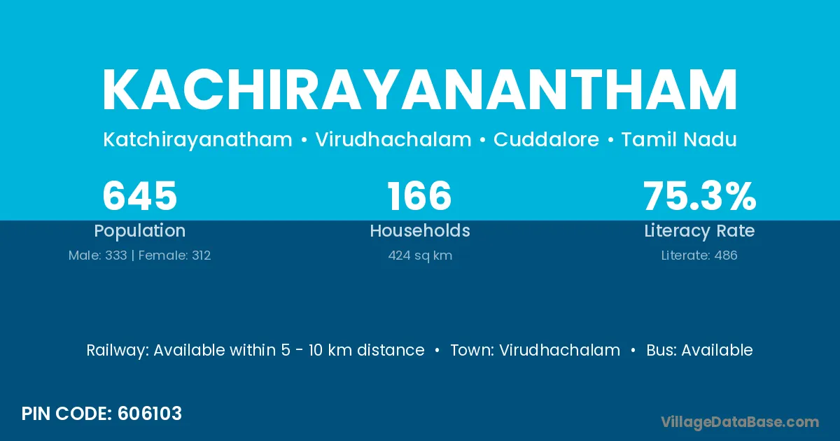 Kachirayanantham village has a total population of 645 people, of which 333 are males and 312 are females.