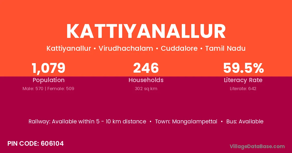 Kattiyanallur village has a total population of 1,079 people, of which 570 are males and 509 are females.