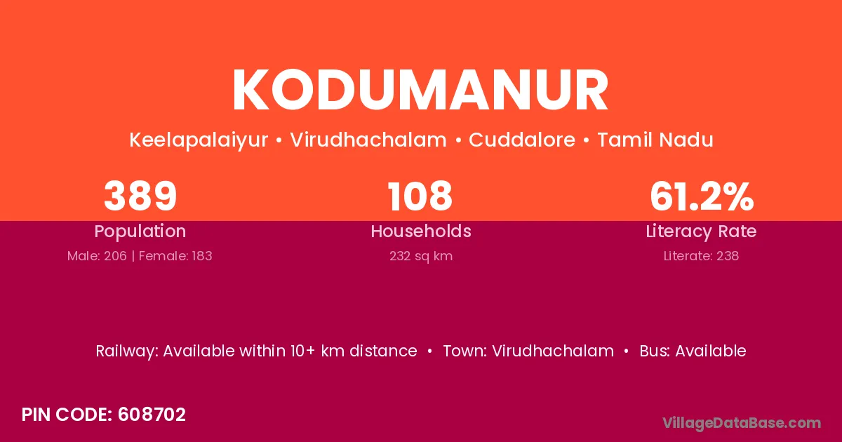 Kodumanur village has a total population of 389 people, of which 206 are males and 183 are females.