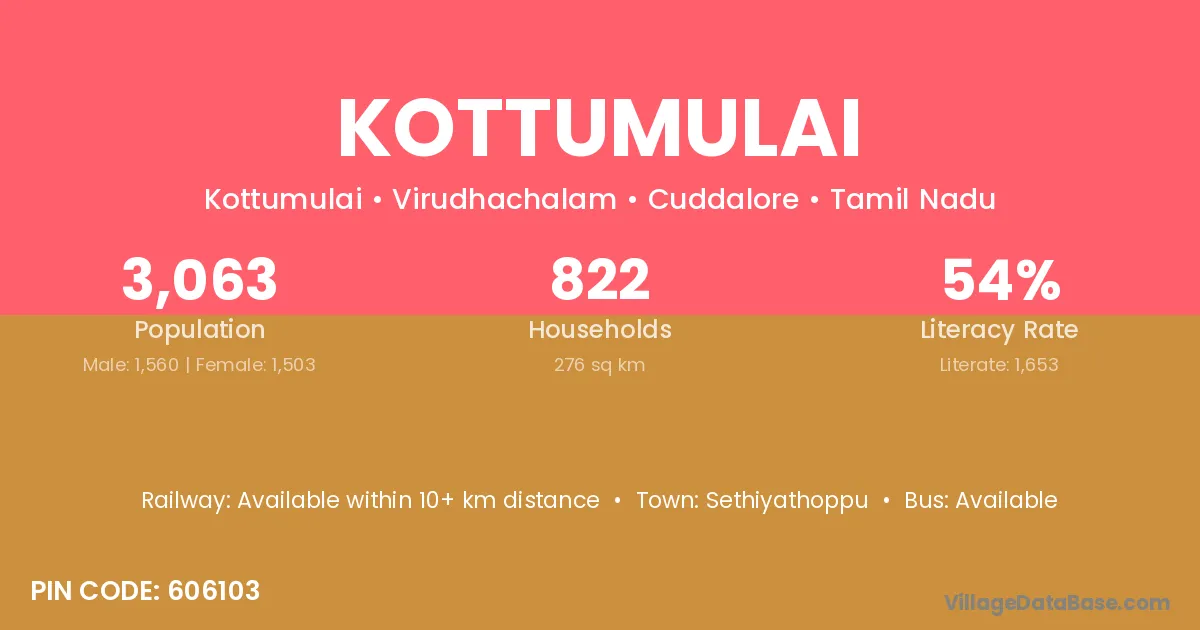Kottumulai village has a total population of 3,063 people, of which 1,560 are males and 1,503 are females.