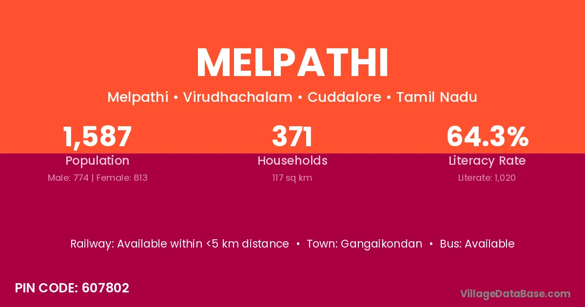 Melpathi village has a total population of 1,587 people, of which 774 are males and 813 are females.