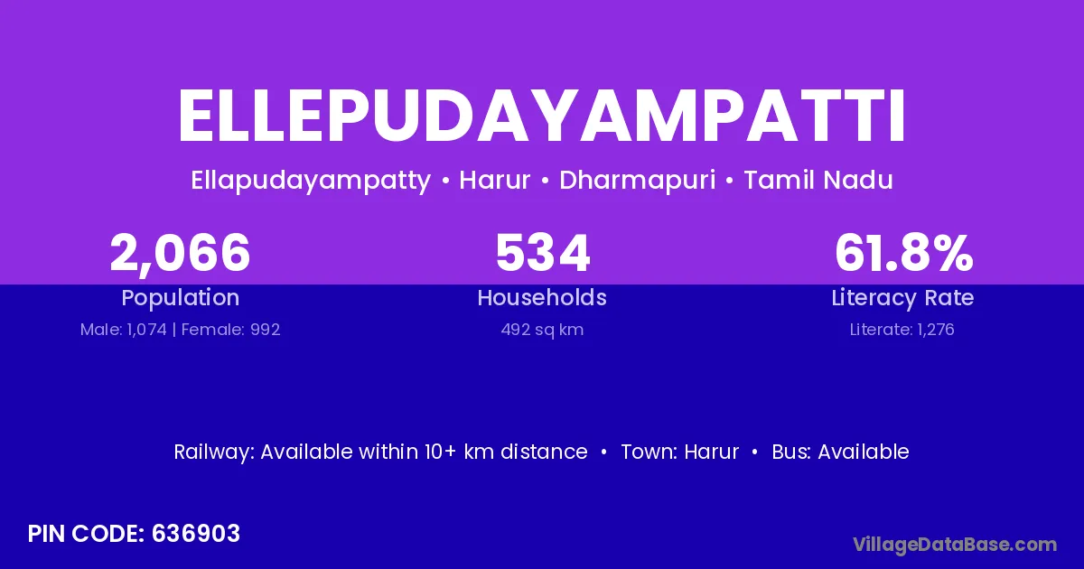 Harur is the nearest town to Ellepudayampatti village for major economic activities
