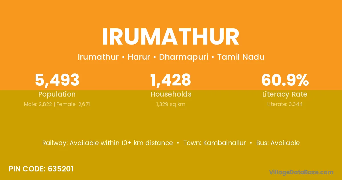 According to Census 2011 information, the village code of Irumathur village is 635201.