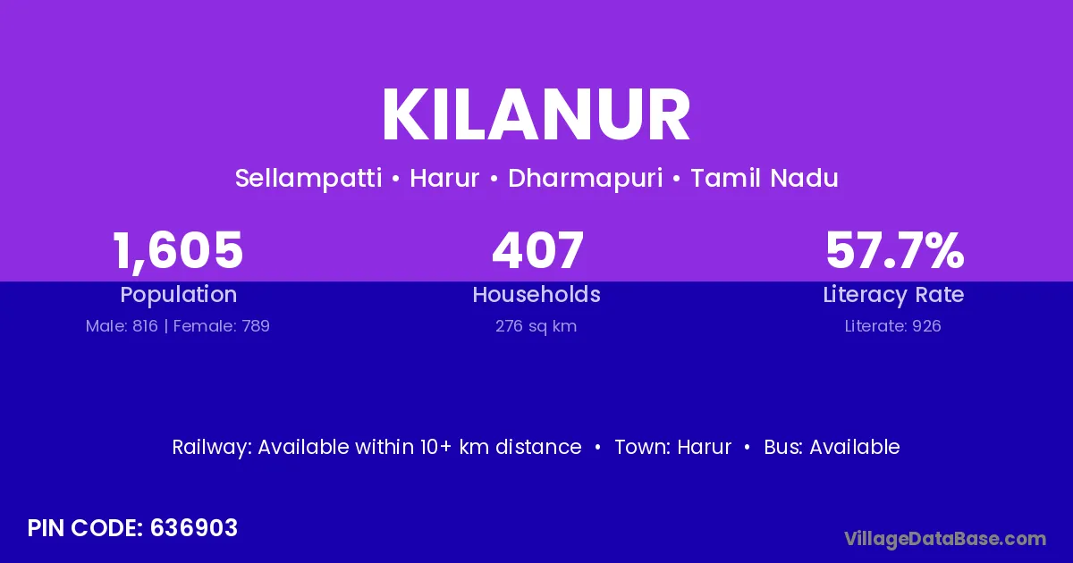 Kilanur village has a total population of 1,605 people, of which 816 are males and 789 are females.