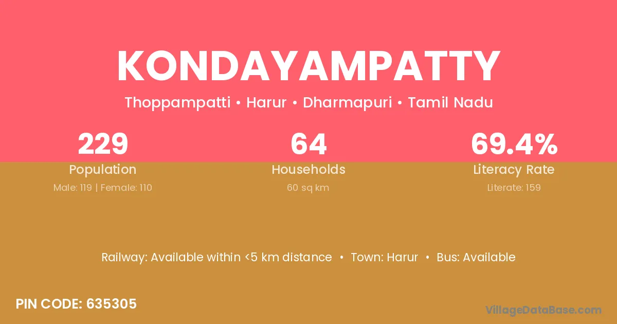 Kondayampatty village has a total population of 229 people, of which 119 are males and 110 are females.