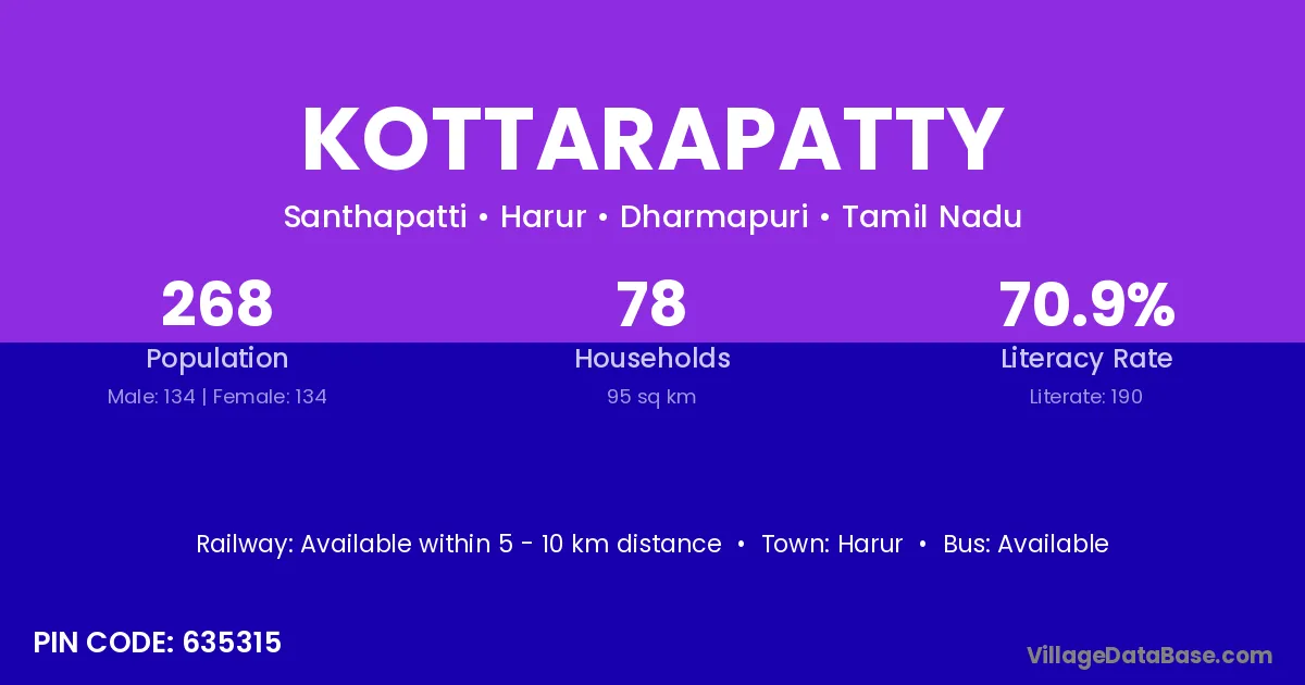 Kottarapatty village has a total population of 268 people, of which 134 are males and 134 are females.