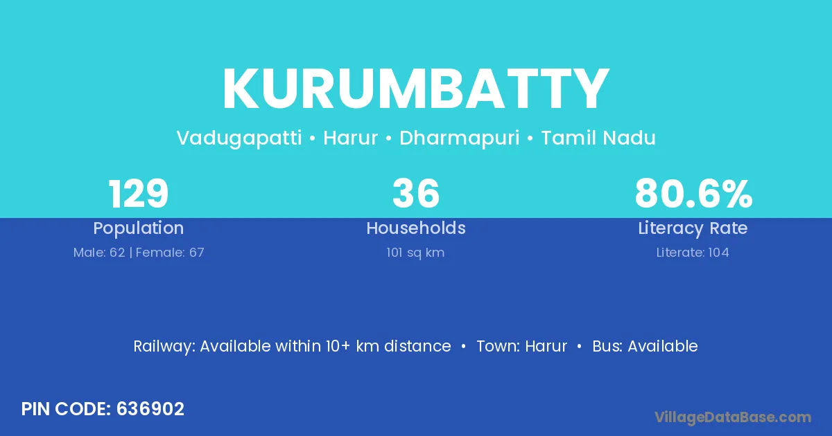 Kurumbatty village has a total population of 129 people, of which 62 are males and 67 are females.