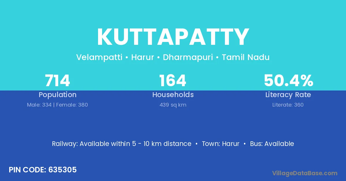 Kuttapatty village has a total population of 714 people, of which 334 are males and 380 are females.