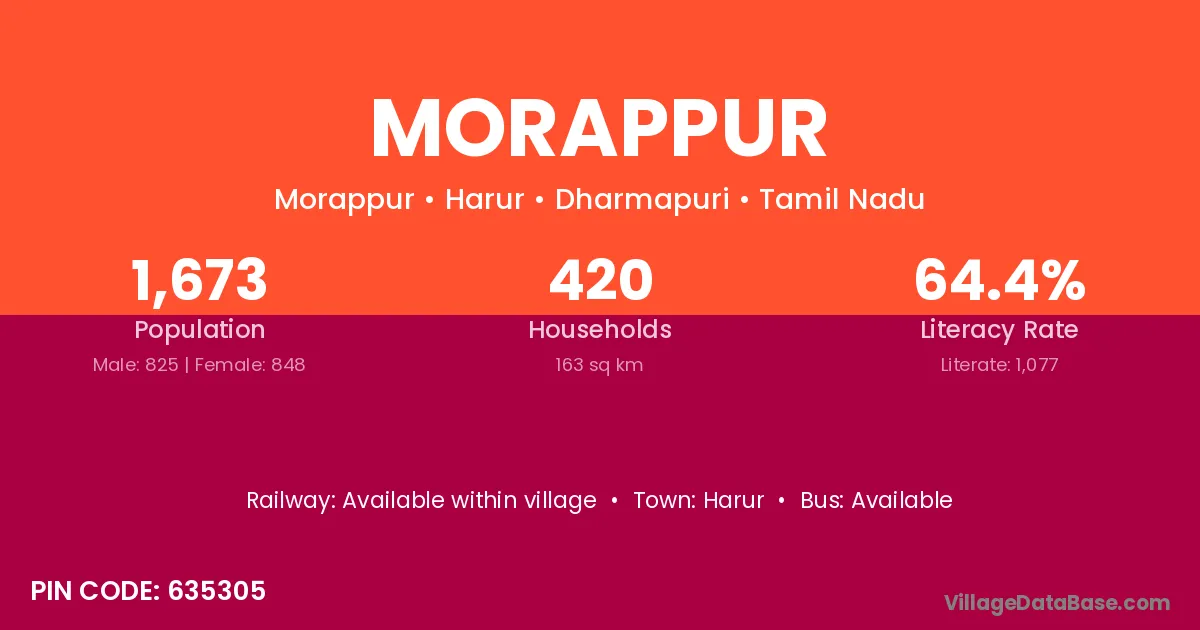 Morappur village has a total population of 1,673 people, of which 825 are males and 848 are females.
