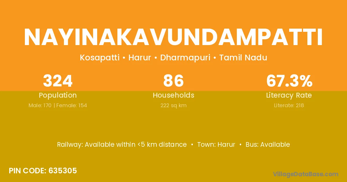 Nayinakavundampatti village has a total population of 324 people, of which 170 are males and 154 are females.