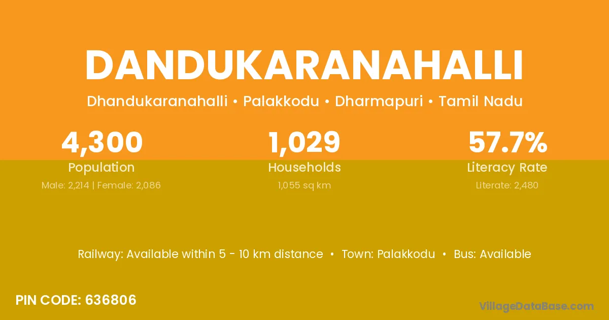 Dandukaranahalli village has a total population of 4,300 people, of which 2,214 are males and 2,086 are females.
