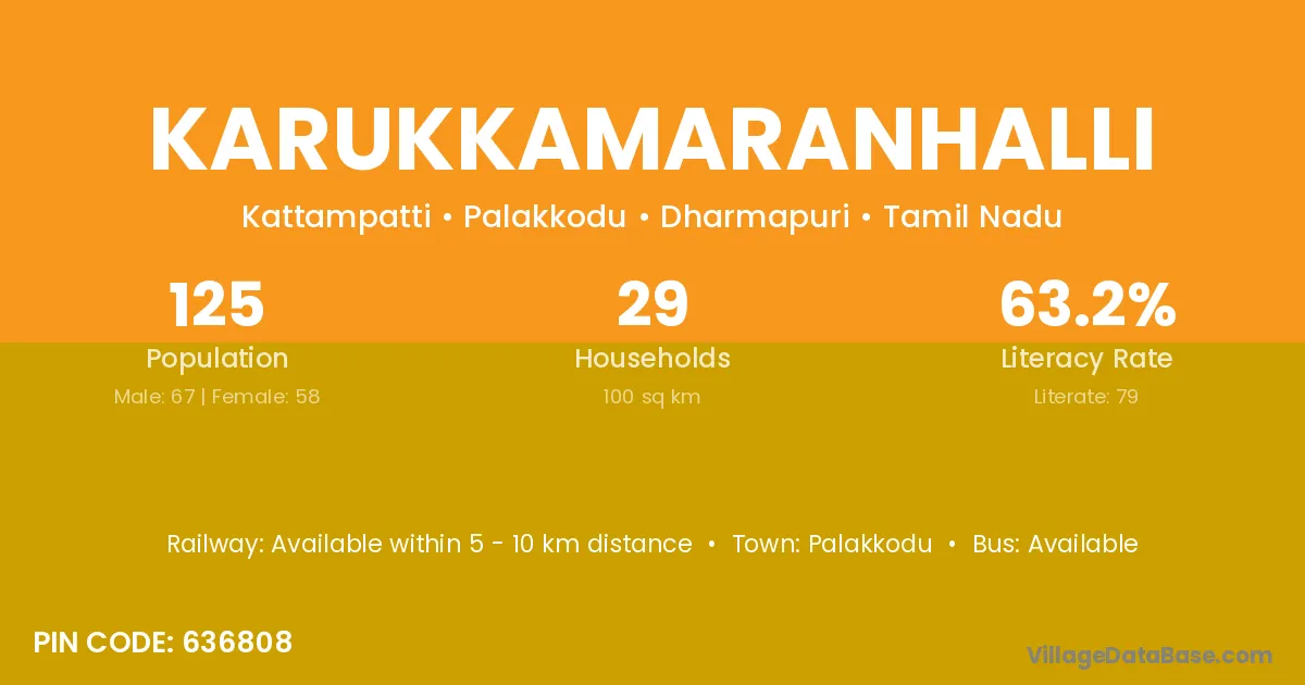 Karukkamaranhalli village has a total population of 125 people, of which 67 are males and 58 are females.