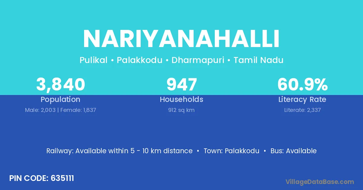 Nariyanahalli village has a total population of 3,840 people, of which 2,003 are males and 1,837 are females.