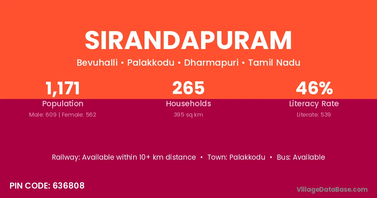 Sirandapuram village has a total population of 1,171 people, of which 609 are males and 562 are females.