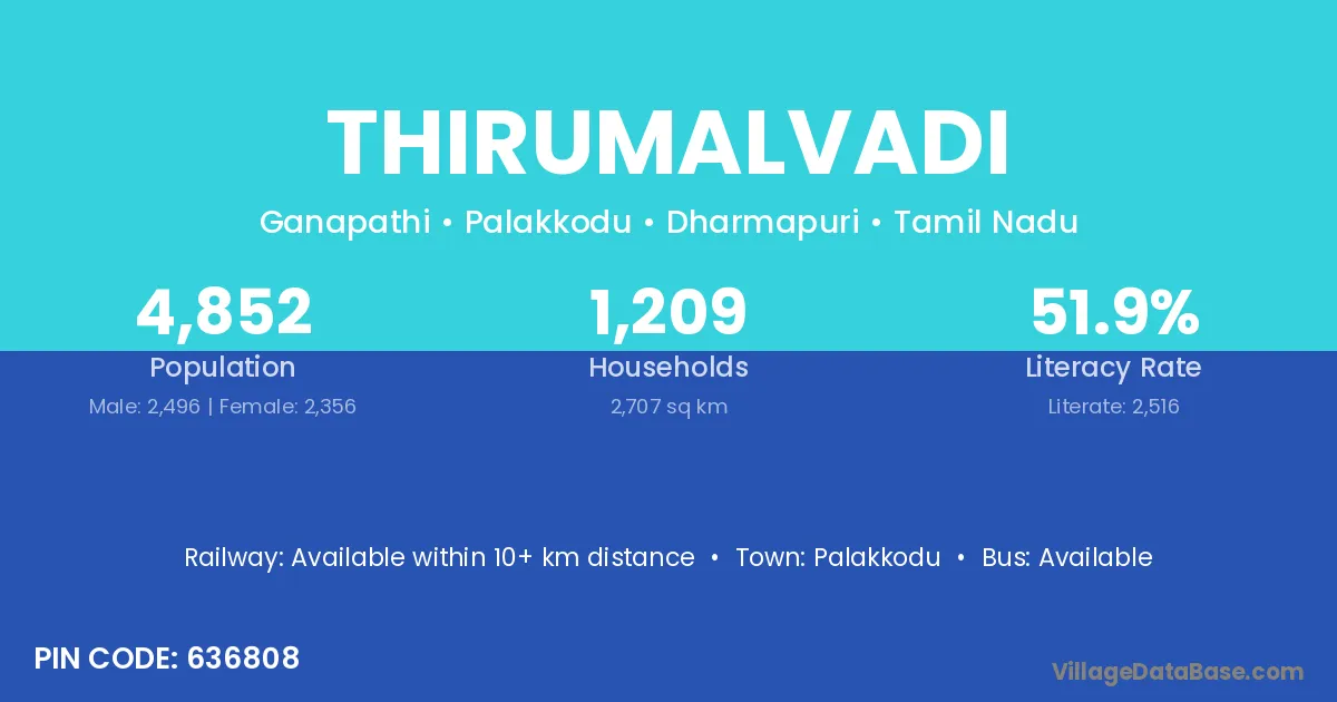 Thirumalvadi village has a total population of 4,852 people, of which 2,496 are males and 2,356 are females.