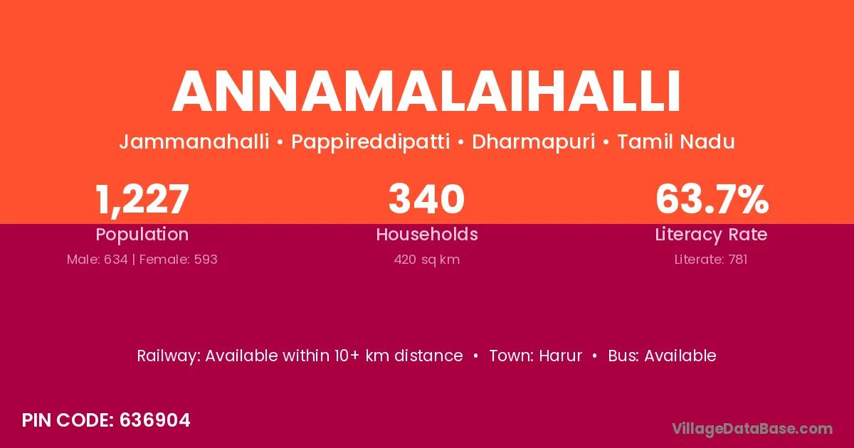 Annamalaihalli village has a total population of 1,227 people, of which 634 are males and 593 are females.