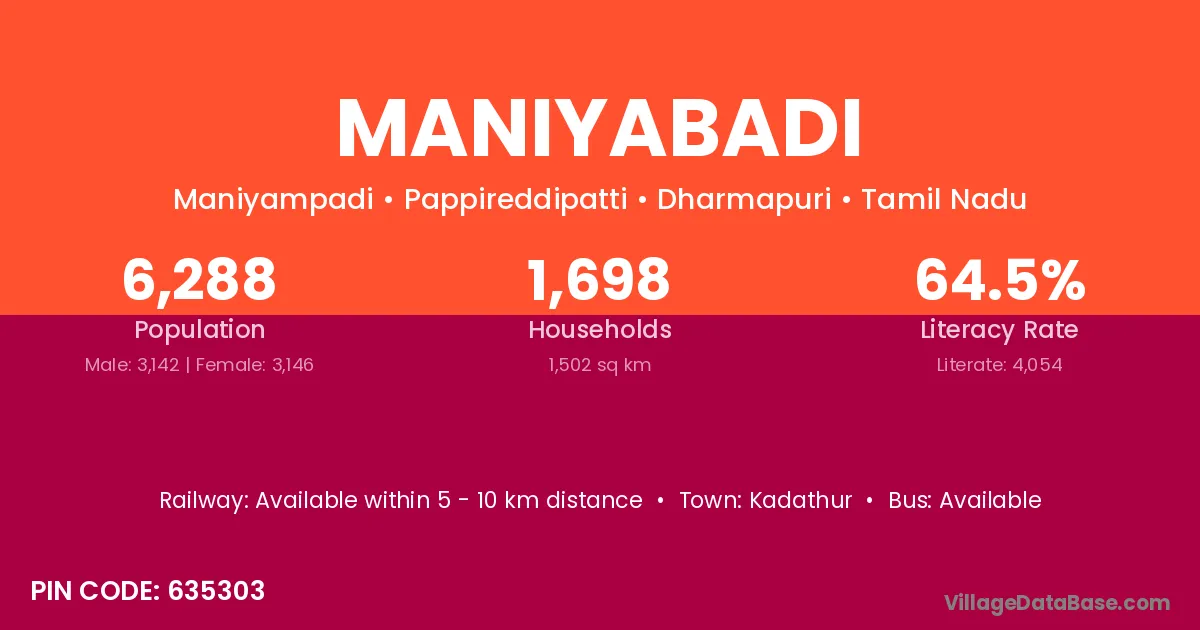 According to Census 2011 information, the village code of Maniyabadi village is 635303.