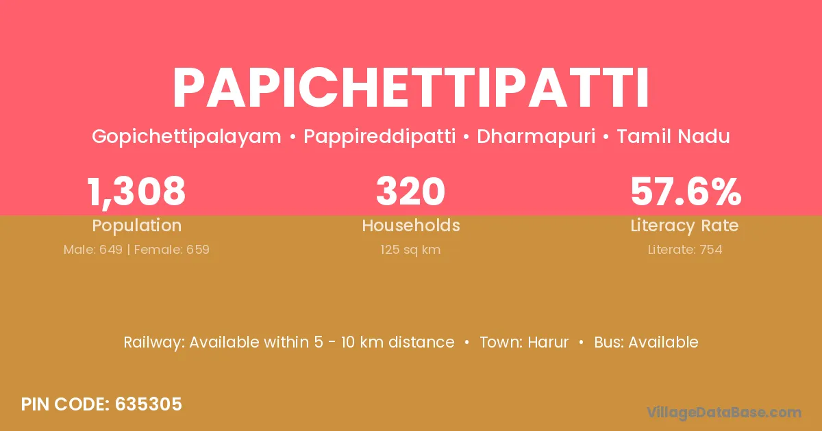 Papichettipatti village has a total population of 1,308 people, of which 649 are males and 659 are females.