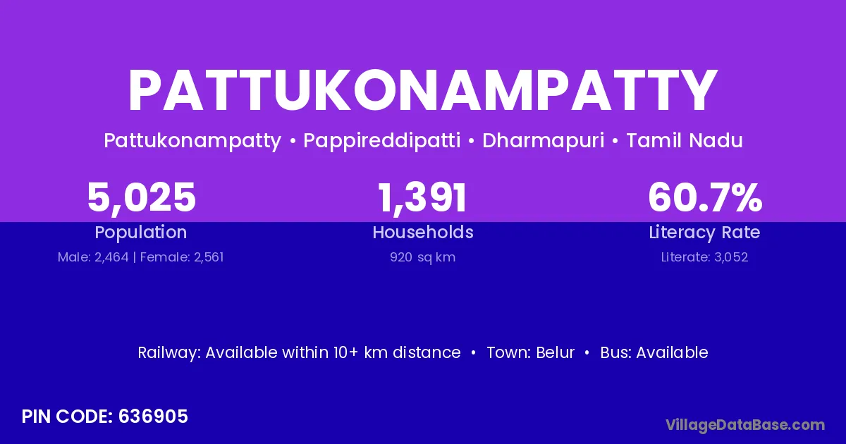 Pattukonampatty village has a total population of 5,025 people, of which 2,464 are males and 2,561 are females.