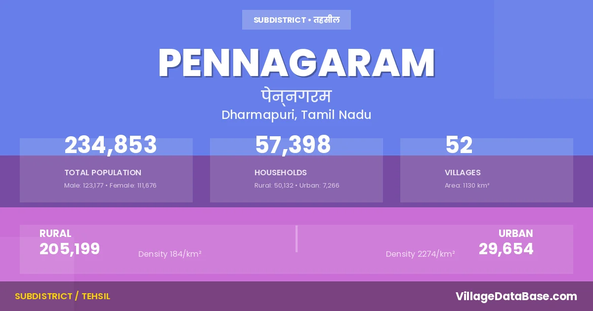 According to the 2011 census The total area of Pennagaram Taluka is 1130 km², with a population of 234853 people. The population density is 208 inhabitants per square kilometre, and there are approximately 57398 houses in the sub district.