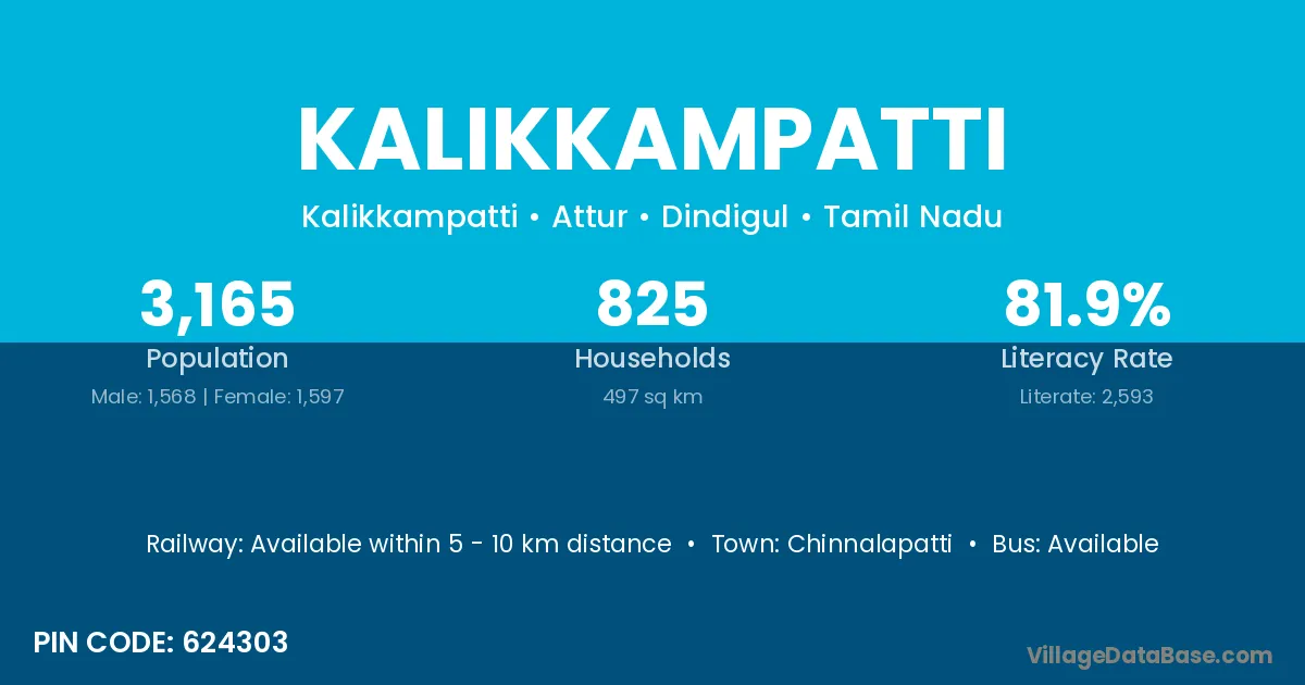 Kalikkampatti village has a total population of 3,165 people, of which 1,568 are males and 1,597 are females.