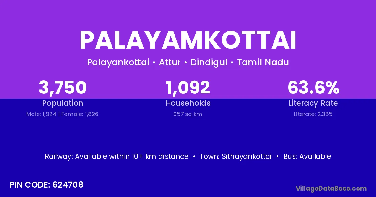 Palayamkottai village has a total population of 3,750 people, of which 1,924 are males and 1,826 are females.