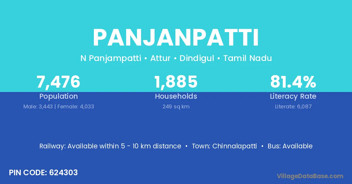 Panjanpatti village has a total population of 7,476 people, of which 3,443 are males and 4,033 are females.