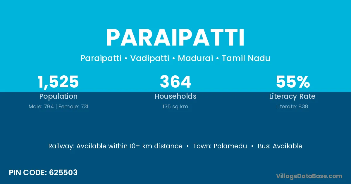Paraipatti village has a total population of 8,353 people, of which 4,239 are males and 4,114 are females.