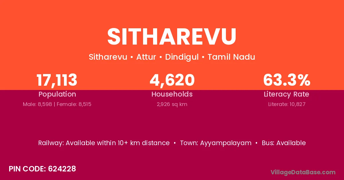 Sitharevu village has a total population of 17,113 people, of which 8,598 are males and 8,515 are females.