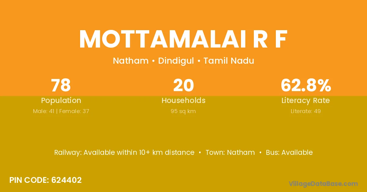 Mottamalai R F village has a total population of 78 people, of which 41 are males and 37 are females.