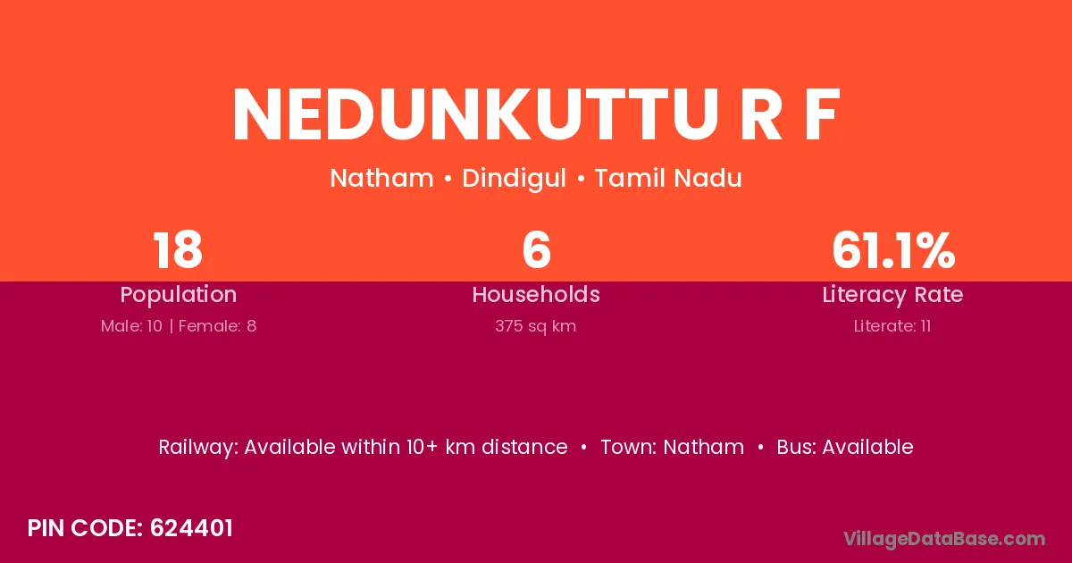 Nedunkuttu R F village has a total population of 18 people, of which 10 are males and 8 are females.