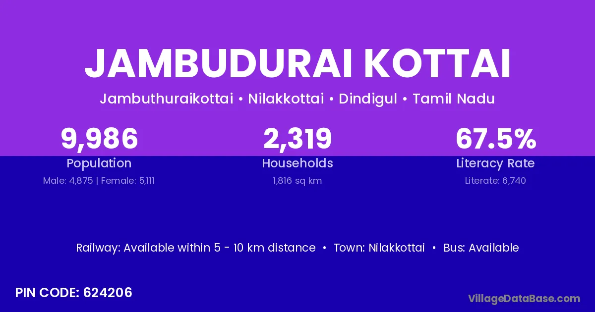 Jambudurai Kottai village has a total population of 9,986 people, of which 4,875 are males and 5,111 are females.