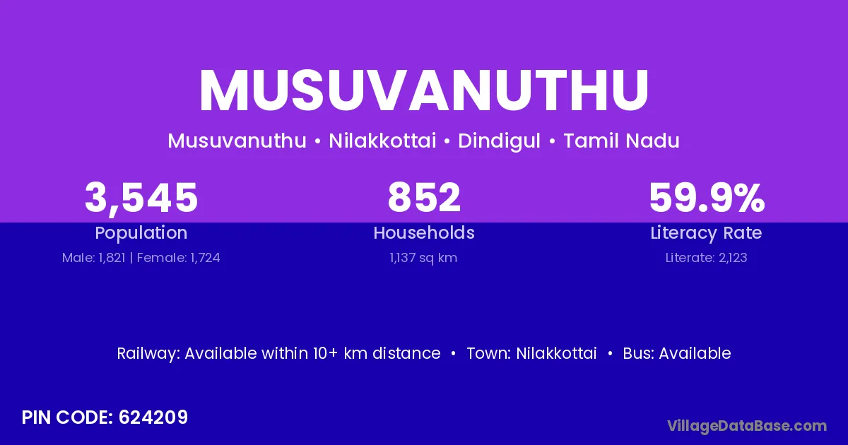 Musuvanuthu village has a total population of 3,545 people, of which 1,821 are males and 1,724 are females.