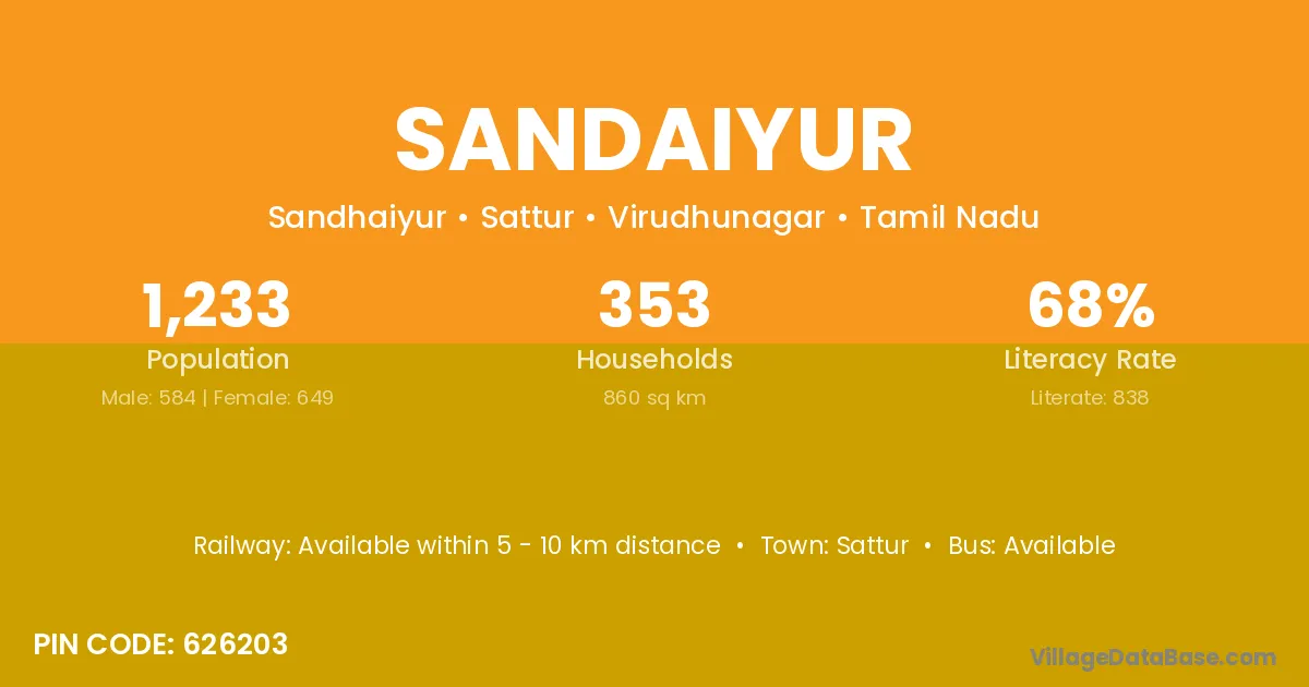 Sandaiyur village has a total population of 3,830 people, of which 1,892 are males and 1,938 are females.