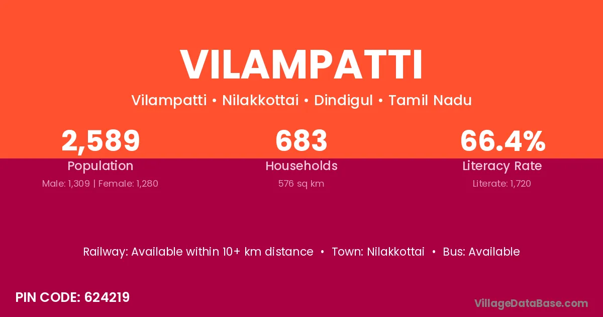 Vilampatti village has a total population of 2,589 people, of which 1,309 are males and 1,280 are females.