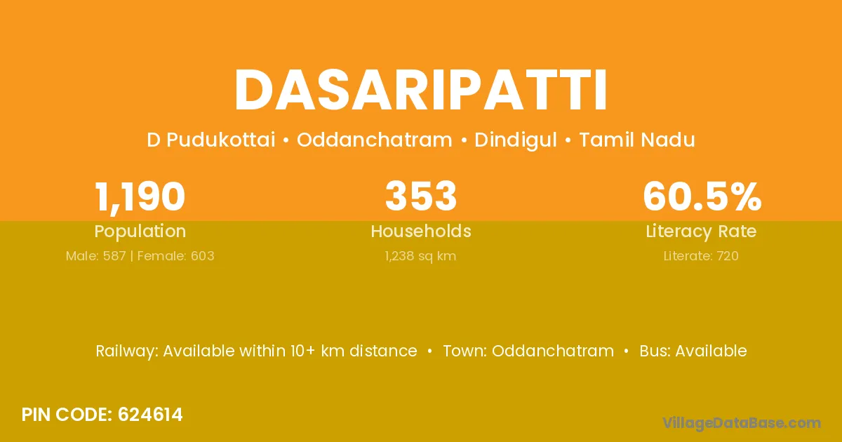 Dasaripatti village has a total population of 1,190 people, of which 587 are males and 603 are females.