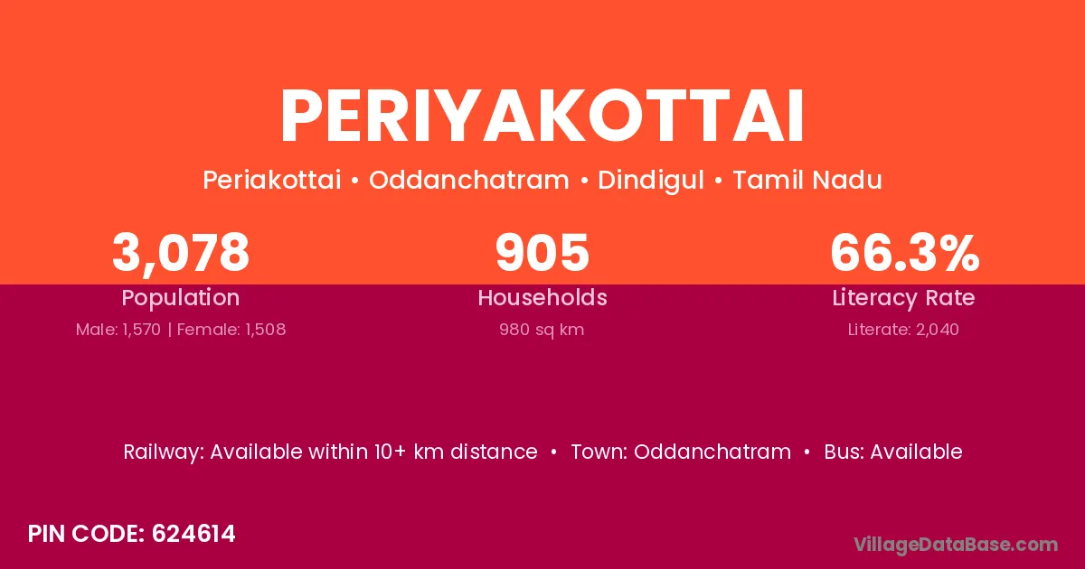 Periyakottai village has a total population of 3,078 people, of which 1,570 are males and 1,508 are females.