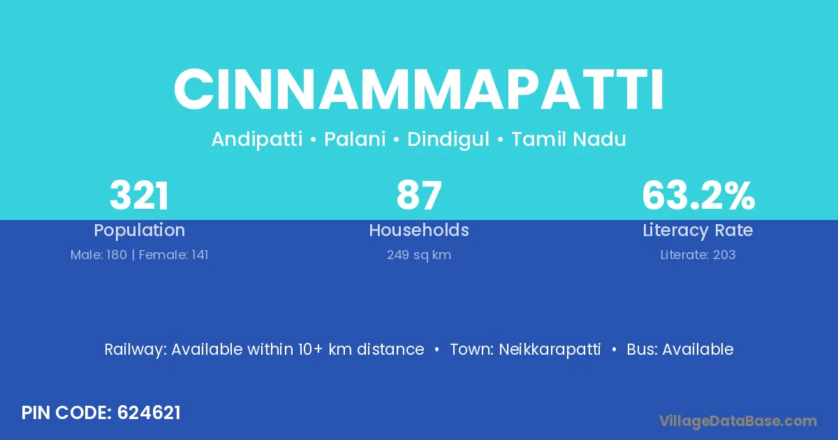 Cinnammapatti village has a total population of 321 people, of which 180 are males and 141 are females.