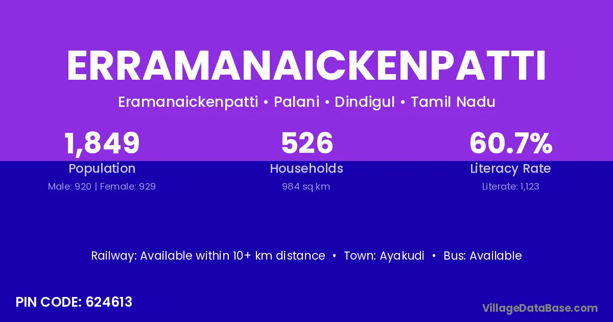 Erramanaickenpatti village has a total population of 1,849 people, of which 920 are males and 929 are females.
