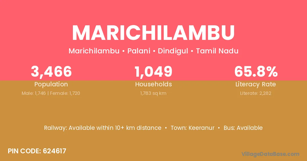 Marichilambu village has a total population of 3,466 people, of which 1,746 are males and 1,720 are females.
