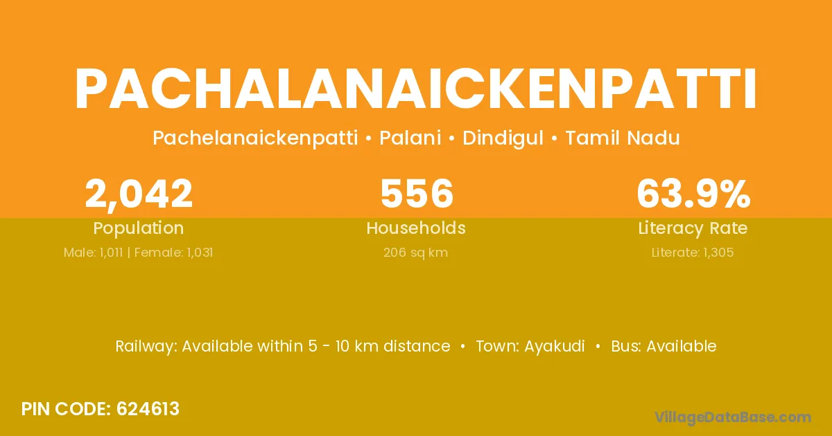Pachalanaickenpatti village has a total population of 2,042 people, of which 1,011 are males and 1,031 are females.
