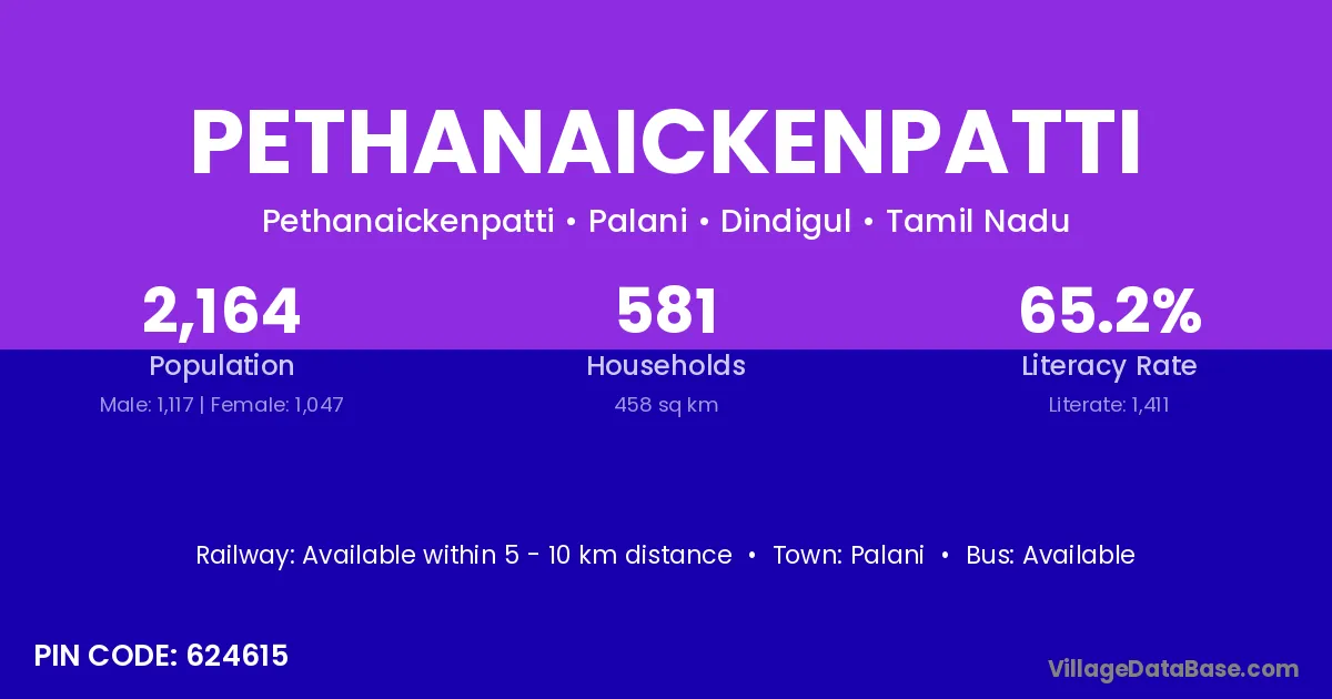 Pethanaickenpatti village has a total population of 2,164 people, of which 1,117 are males and 1,047 are females.