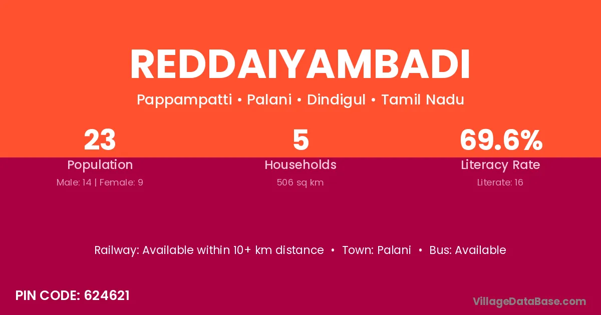 According to Census 2011 information, the village code of Reddaiyambadi village is 624621.