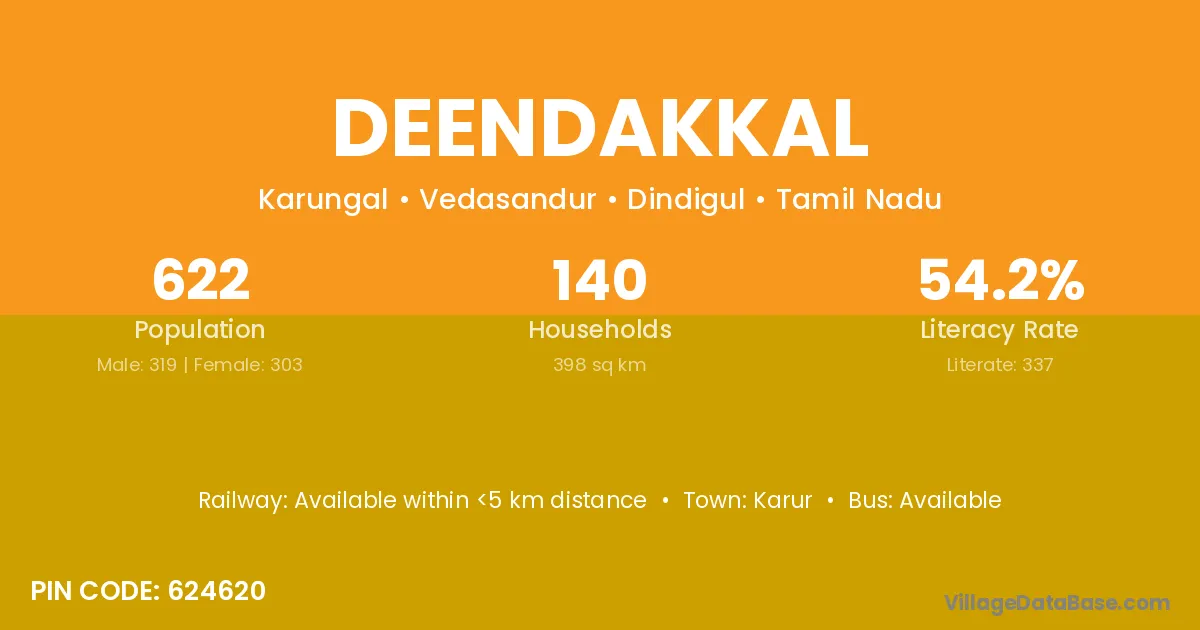 Deendakkal village has a total population of 622 people, of which 319 are males and 303 are females.
