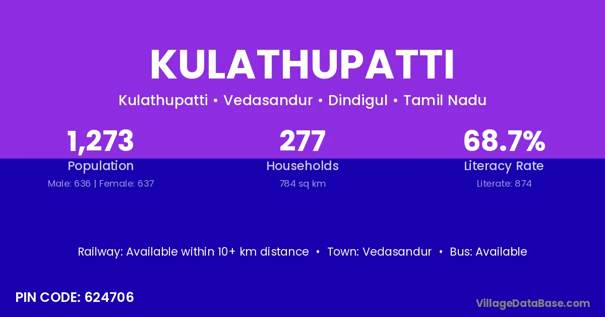 Kulathupatti village has a total population of 1,273 people, of which 636 are males and 637 are females.