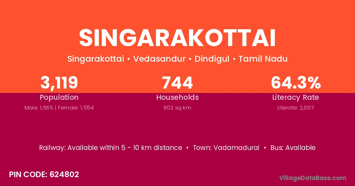 Singarakottai village has a total population of 3,119 people, of which 1,565 are males and 1,554 are females.