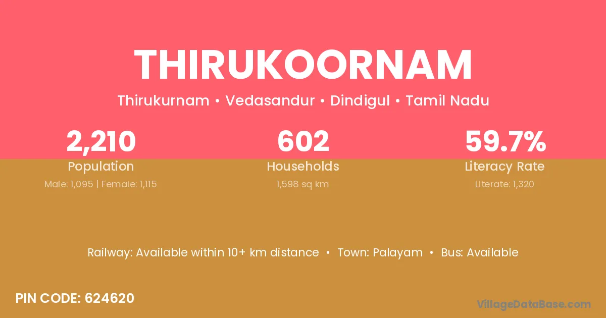 Thirukoornam village has a total population of 2,210 people, of which 1,095 are males and 1,115 are females.