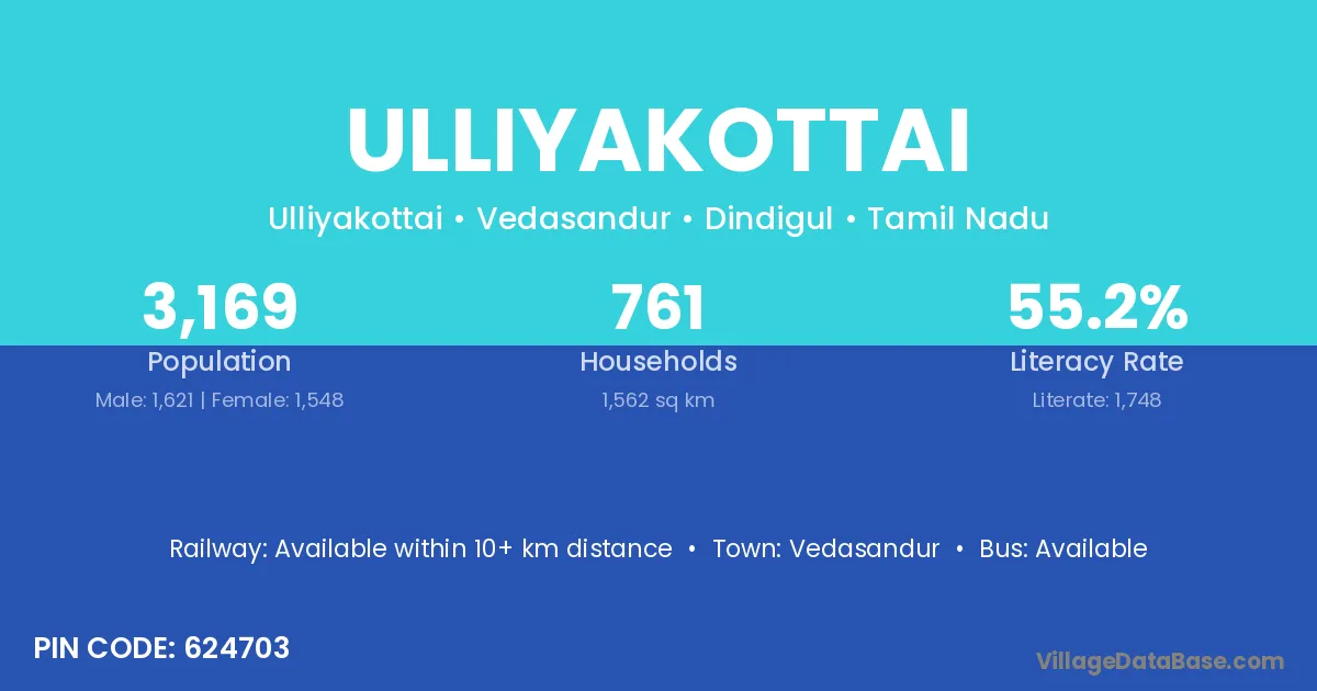 Ulliyakottai village has a total population of 3,169 people, of which 1,621 are males and 1,548 are females.