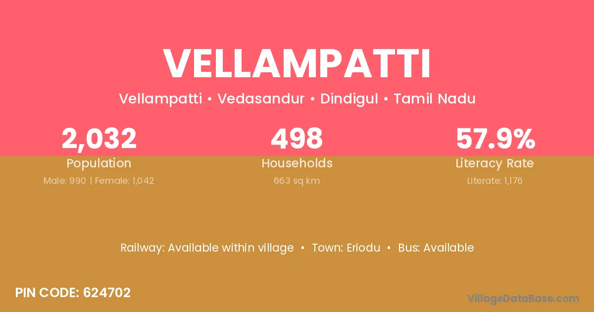 Vellampatti village has a total population of 2,032 people, of which 990 are males and 1,042 are females.